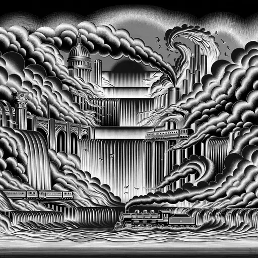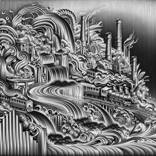 With the idea of a densly packed scene filled with trains, smoke, and environmental effects, I prompted DALL-E 3 to generate my scenes. Hundreds of iterations later, I have a collection of choice, black and white base images suitable for color cycling.